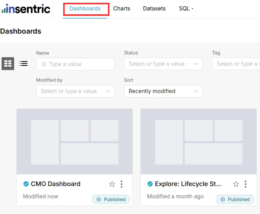 - Select a dashboard — such as CMO Dashboard.